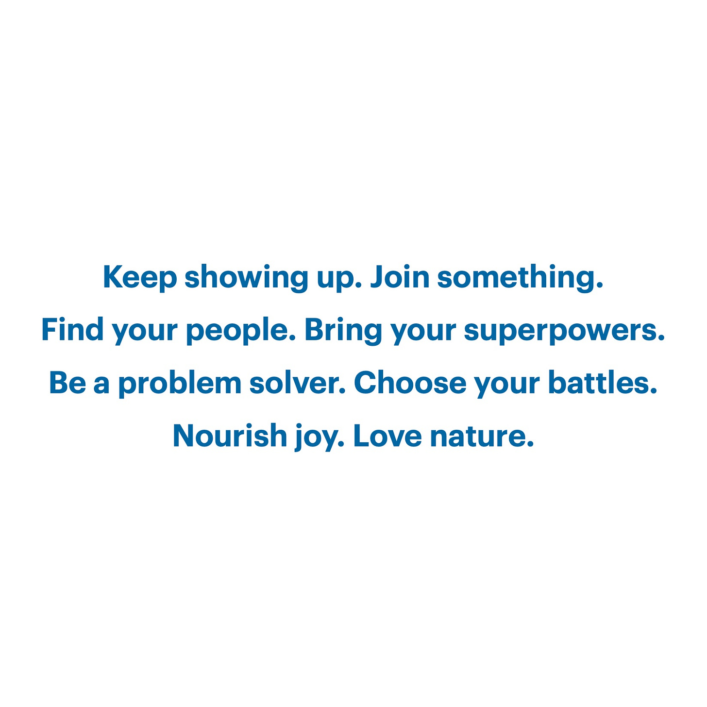 That’s how my dad put it. My mom prefers the cornier, “Do your best and don’t worry about the rest.” And it’s the best advice my parents have given me. Keep things in perspective by keeping at least one eye firmly on the future of life on Earth. Choose something to fight for, and, please, no friendly fire.